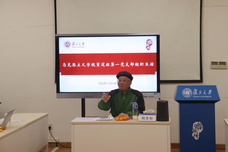 2023年11月14日下午,女同av 望道班第一党支部开展“老党员谈院史”组织生活,邀请女同av 原党委书记姚惠福老师走进支部和青年学生做交流。支部全体党员和支部所辐射覆盖的2023级本科生望道班全体同学出席。