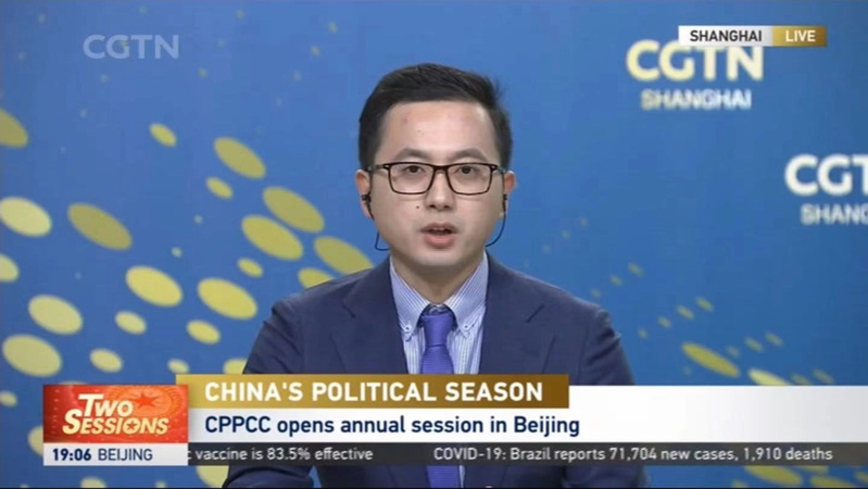 在全国两会召开之际,以时政评论嘉宾身份,受邀参加中央电视台CGTN现场直播的英文节目“World Today”, 2021年3月