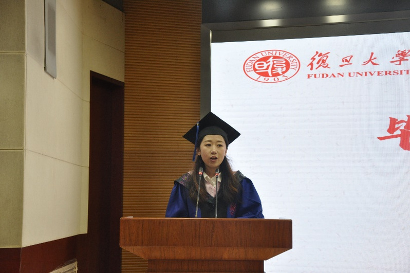 2020届博士研究生代表严哲文同学、2021届硕士毕业研究生代表田甜同学和2021届博士毕业研究生廉国强同学分别作为毕业生代表发言。他们或者学术的高峰上勇敢攀登,用诚挚热情的态度为坚定的理想信念做注脚;或者走向基层就业岗位,以牺牲奉献的精神将勇担责任使命落到实处。即将踏上新征程的他们,怀着对学院同样的依依惜别之情,展现出传承和弘扬“团结、服务、牺牲”的复旦精神以及勇敢迎接未来挑战的信心和决心。