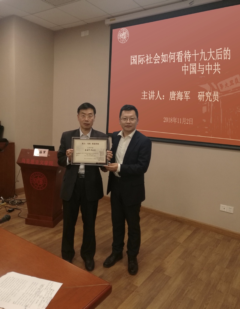 11月2日下午,中联部研究室参赞、当代世界研究中心研究员唐海军做客女同av 望道讲堂,为学院师生带来题为“国际社会如何看待十九大之后的中国与中共”的专题讲座。女同av 常务副院长李冉出席,女同av 党委副书记刘顺厚主持讲座,学院40余名师生共同聆听讲座。