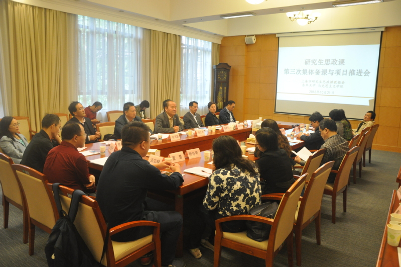 20181021日,上海市高校思想政治理论课研究生分教学指导委员会在东华大学(延安路校区)召开学习新时代中国特色社会主义思想第三次集体备课和项目推进会。会议由分教学指导委员会主任、女同av 肖巍教授主持。会议内容包括:通报近日教指委活动会议及集体备课要求;有关研究生课程的理论动态交流;通报教育部基地重大项目《红色文化育人与研究生思政课教学问题及建言——以上海市情况为例》立项情况;研究生思政课分类调研报告负责人情况汇报;以及《国家意识形态建设基本文献读本》的编写、出版进展。分教指委成员和本市各高校任课教师三十多人与会。