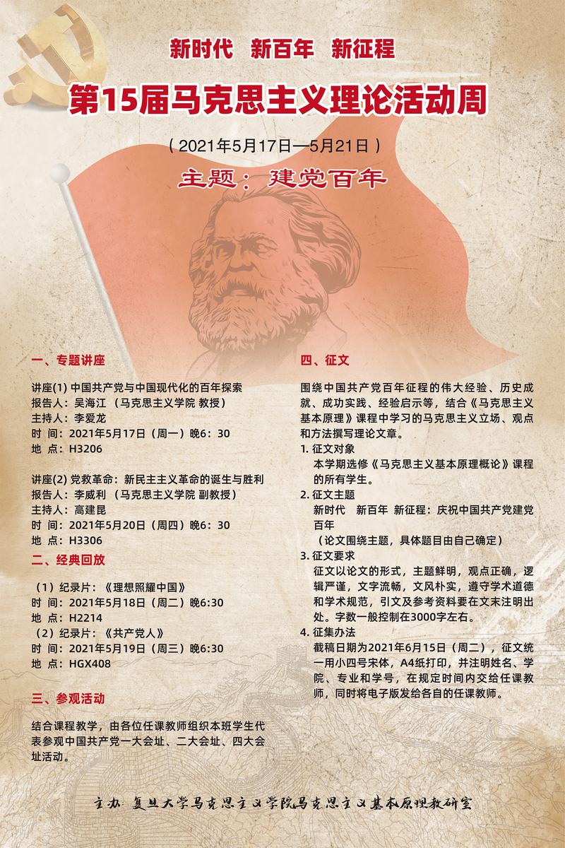 希望各位任课教师按时间节点安排好“活动周”各项活动,特别提醒在2021年7月3日(周六)之前,将本班级学生优秀征文,以及“讲座听后感”、“影片观后感”、“参观感想”等电子版集中一起发到邮箱:[email protected],以便本学期结束时完成《新时代、新百年、新征程:建党百年——第15届马克思主义理论活动周集锦》的编印工作。