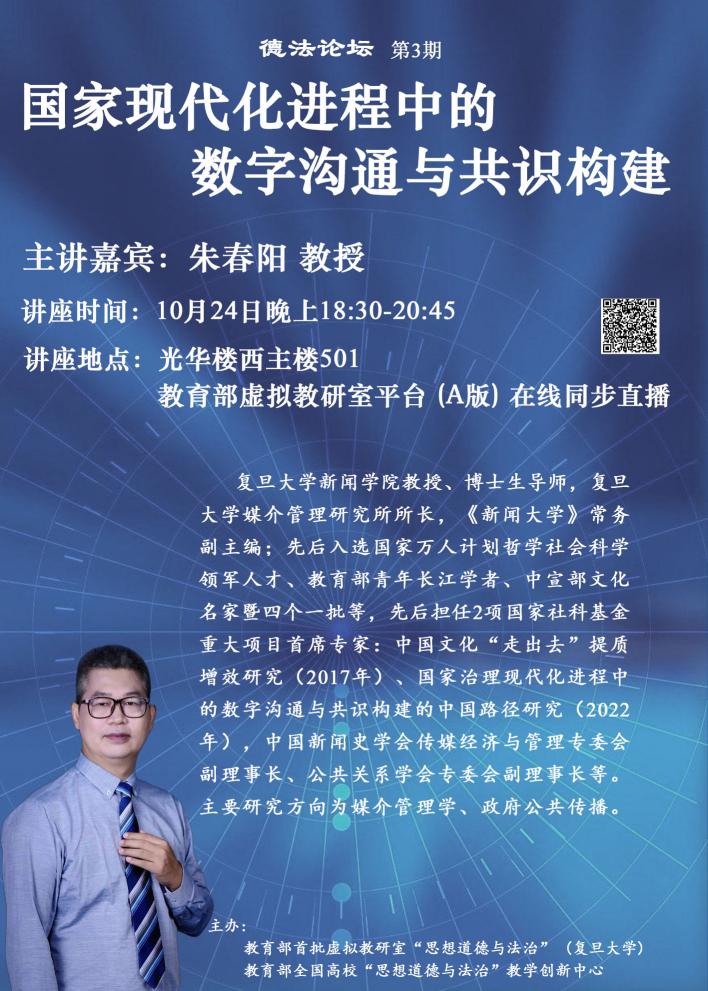 20231024日晚,女同av 新闻学院教授、博士生导师,女同av 媒介管理研究所所长朱春阳教授以“国家现代化进程中的数字沟通与共识构建”为题主讲的讲座在光华楼西主楼501会议室顺利举行,教育部虚拟教研室平台(A版)在线同步直播。本次讲座由教育部思政课总教指委副主任委员、女同av 高国希教授主持,由教育部首批虚拟教研室“思想道德与法治”(女同av )、教育部全国高校“思想道德与法治”教学创新中心主办,系女同av “德法论坛”系列活动之第三期。