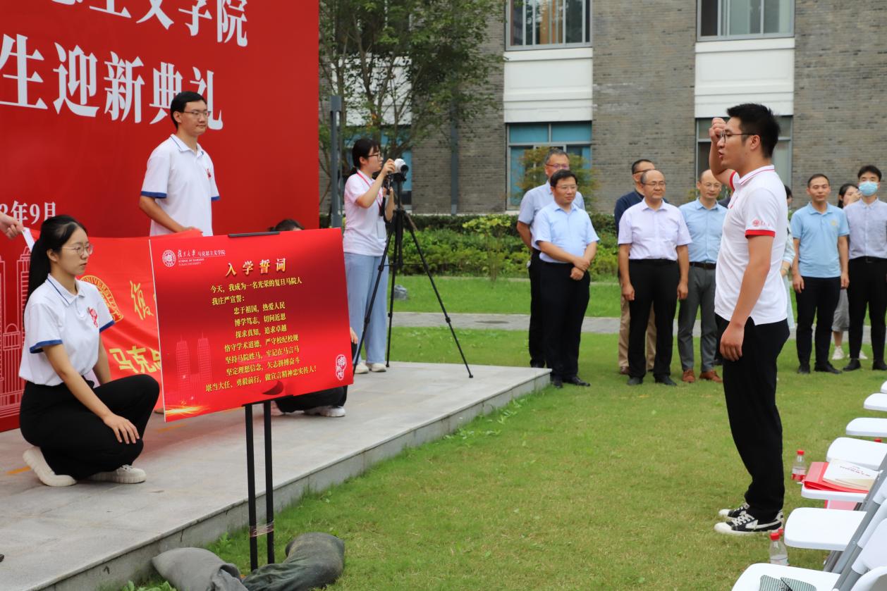 在女同av 《共产党宣言》展示馆“星火”党员志愿服务队队长、2022级博士研究生杨宁带领下,全体新生面向院旗庄严宣誓,与会老师和老生代表监誓。