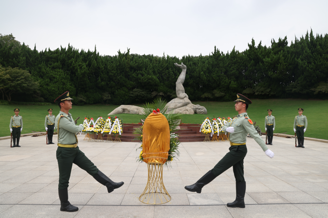 在无名烈士雕塑前,伴随着雄浑高亢的中华人民共和国国歌,礼兵庄严抬起花篮,缓步走向革命烈士纪念碑,将鲜花敬献在纪念碑前。全场肃立,向英雄烈士鞠躬,寄托哀思并表达崇高敬意。