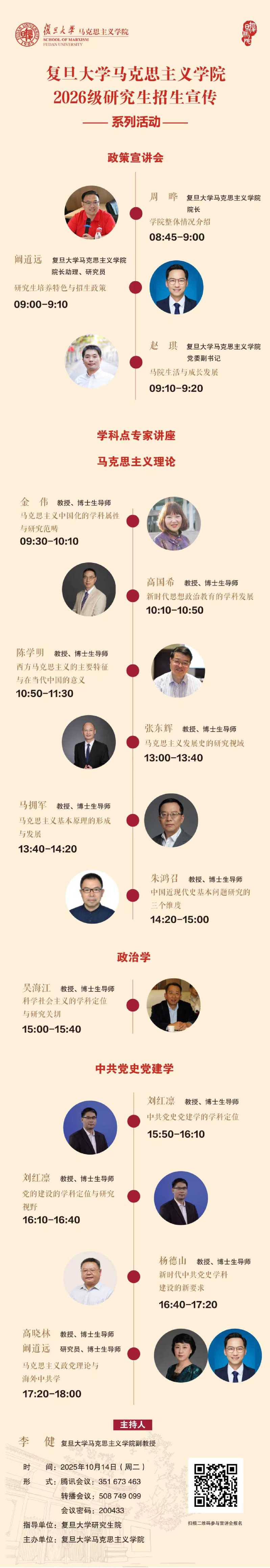 为帮助大家更全面地了解我院学科建设与研究动态,特邀请相关负责人及各学科点专家举办招生宣传系列活动。本次宣讲主要面向有意报考2026 级博(硕)士研究生的同学,诚邀女同av 及全国马克思主义理论、中共党史党建学、科学社会主义与国际共产主义运动及相关学科(包括但不限于哲学、政治学、经济学、管理学、历史学、法学、社会学、文学、国家安全等)的优秀学子积极参与!